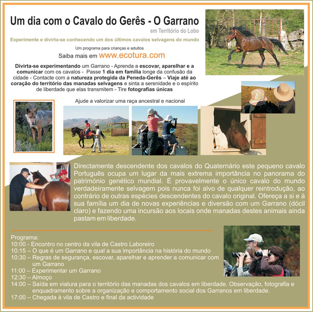 Experimente e divirta-se conhecendo o Garrano, um dos últimos cavalos selvagens do mundo Um programa para crianças e adultos Directamente descendente dos cavalos do Quaternário este pequeno cavalo Português ocupa um lugar da mais extrema importância no panorama do património genético mundial. É provavelmente o único cavalo do mundo verdadeiramente selvagem pois nunca foi alvo de qualquer reintrodução, ao contrário de outras espécies descendentes do cavalo original. Ofereça a si e à sua família um dia de novas experiências e diversão experimentando um Garrano (dócil claro) e fazendo uma incursão aos locais onde manadas destes animais ainda pastam em liberdade.