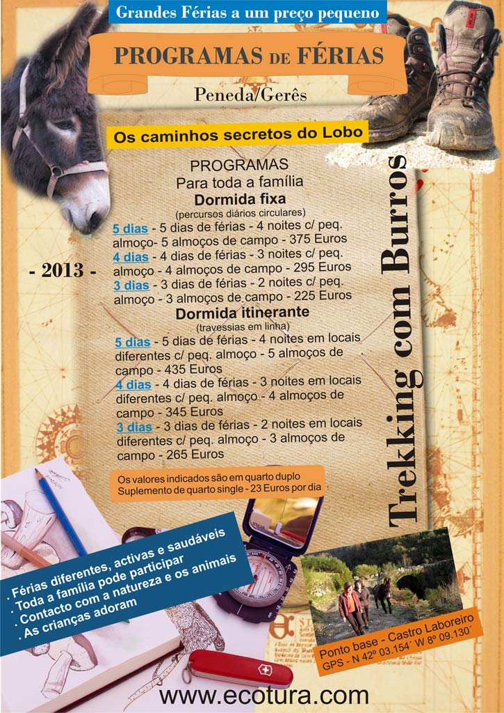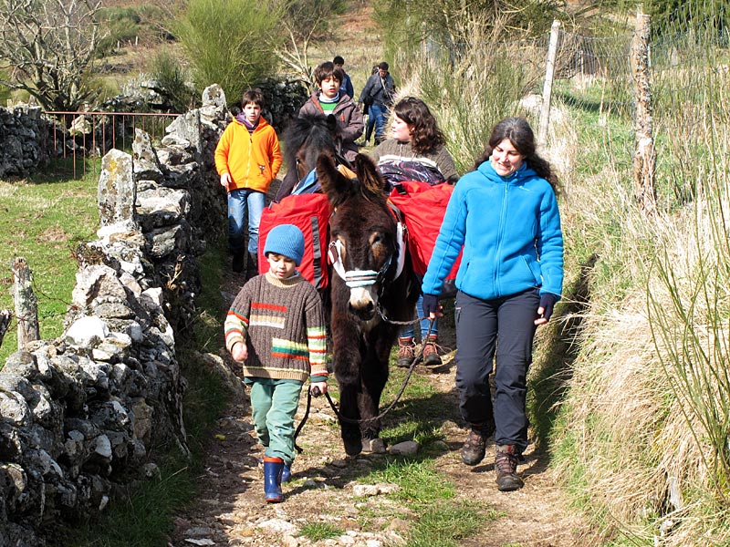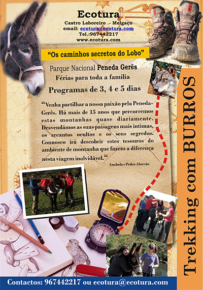 A Ecotura em parceria com a AEPGA (www.aepga.pt) criou uma nova maneira de usufruir a montanha e a natureza, o trekking com burros e póneis de montanha. Esta modalidade de caminhar, em grande expansão entre os caminheiros de toda a europa, remonta a tempos imemoráveis em que os burros e os póneis, como o burro Mirandês e o Garrano do Gerês, eram a companhia de quem atravessava a montanha, ajudando a transportar a bagagem pelos caminhos sinuosos que ligavam as aldeias. Hoje, estes simpáticos animais permitem que as crianças acompanhem os seus pais e avós no seu trekking pela montanha, transportando os pequenos no seu dorso quando necessário. A companhia do burro e do pónei permite-nos caminhar leves sem termos a necessidade de racionar a merenda e a água ou deixar em casa aqueles binóculos especiais ou telescópio mais pesado mas bom. Ou que, quando escolhemos o material fotográfico para levar, sejamos obrigados a sacrificar parte dele para não irmos “carregados que nem um burro”. O peso que iremos pedir a estes nossos novos amigos para transportar será ligeiro (máximo de 30 a 40 kg) mas mais do que suficiente para levarmos tudo o que precisamos. Estes programas de trekking com burros